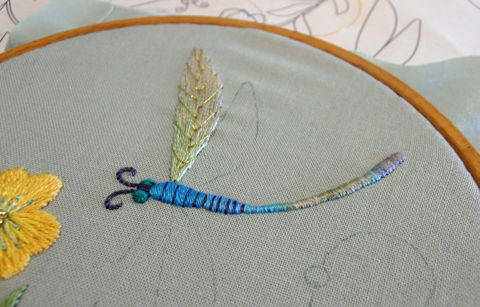 I had a bit of soft green cotton in my (yet another) stash. It is a homespun that I use for stumpwork leaves but I like that the colour blends with the shades of the wings and at the same time allow the rest of the dragonfly and the yellow buttercups 'pop'. The fabric is a little bit too fine to support the stitching. I am not a tight stitcher, but there are still puckers beginning to form around the wing. Since I don't want to back this project I am now on the hunt for a suitable fabric in the same (or very, very similar colour).