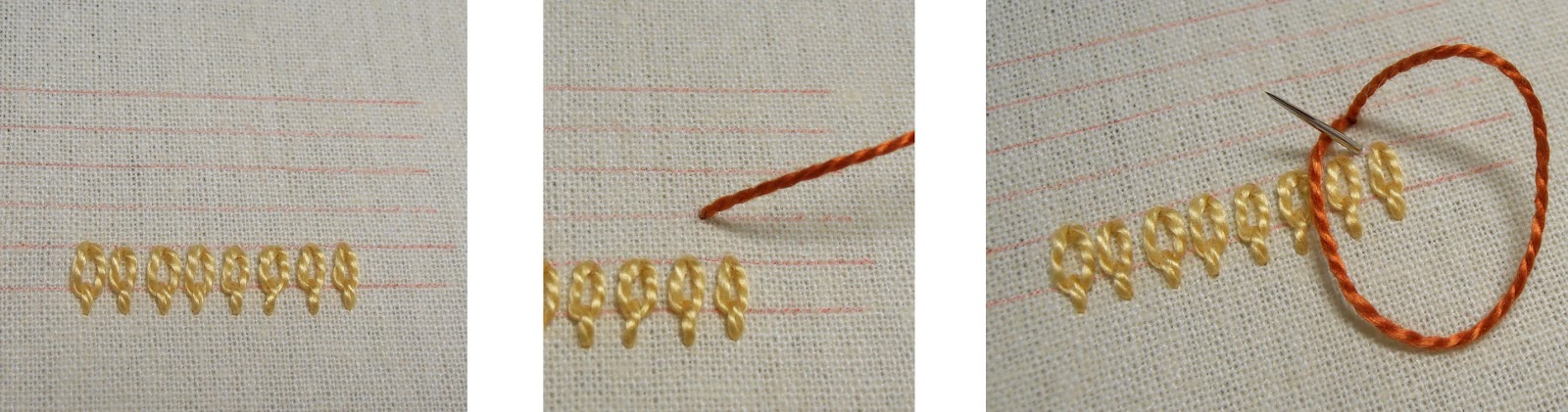 1. Stitch detached chains (lazy daisy) side by side between the lower two lines.
